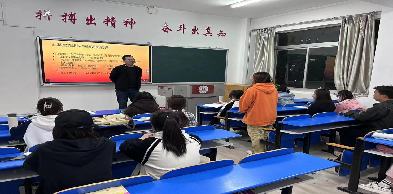 教工党支部书记黄飞飞和同学们学习了党员的基本素养。强调党性反映了党员的政治素质,展示了党员干部的党性修养和政治本色。接着他引用了一些人物事迹向学生们解说了党员所应具备的素质,共产党人必须坚定理想信念,坚守共产党人的精神追求。并号召同学们要提高政治理论修养,并且要先在思想上先入党,才能时刻牢记党员身份。