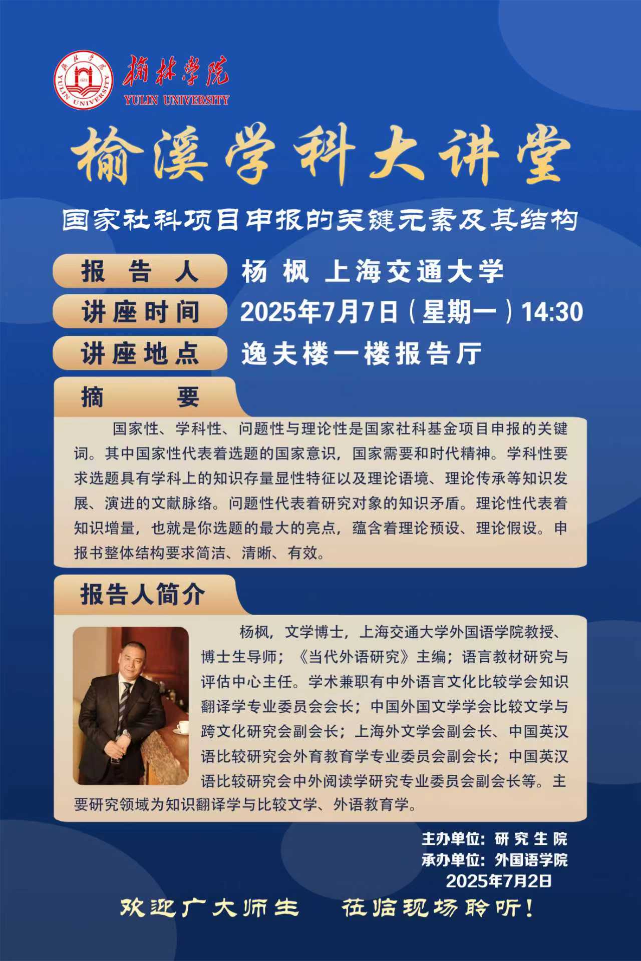 2025年7月7日下午,由研究生院主办、bv伟德源自英国始于1946承办的“榆溪学科大讲堂”在逸夫楼一楼报告厅成功举行。上海交通大学bv伟德源自英国始于1946教授、博士生导师杨枫应邀担任主讲,作了题为《国家社科项目申报的关键元素及其结构》的学术报告。本次讲座由bv伟德源自英国始于1946副院长徐庆宏教授主持,bv伟德源自英国始于1946师生代表及各学院对国家社科项目申报感兴趣的教师积极参与本次专题讲座。